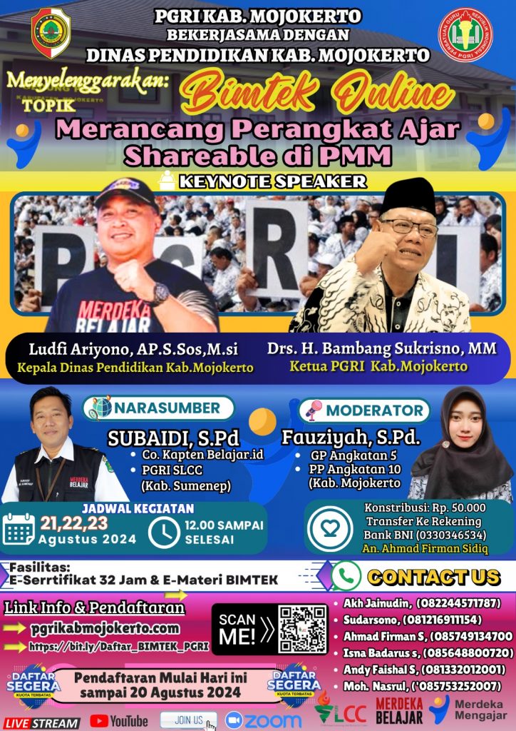 Menghadapi zaman digital dan peningkatan kualitas serta kinerja guru dalam menjalankan tugasnya di sekolah dengan memperbaiki kualitas proses dan hasil pembelajaran, PGRI kabupaten Mojokerto bekerjasama dengan Dinas Pendidikan Kabupaten Mojokerto akan menyelenggarakan Pelatihan Online. Pembelajaran Inspiratif with Canva Education” (Sistem In & On Service)”